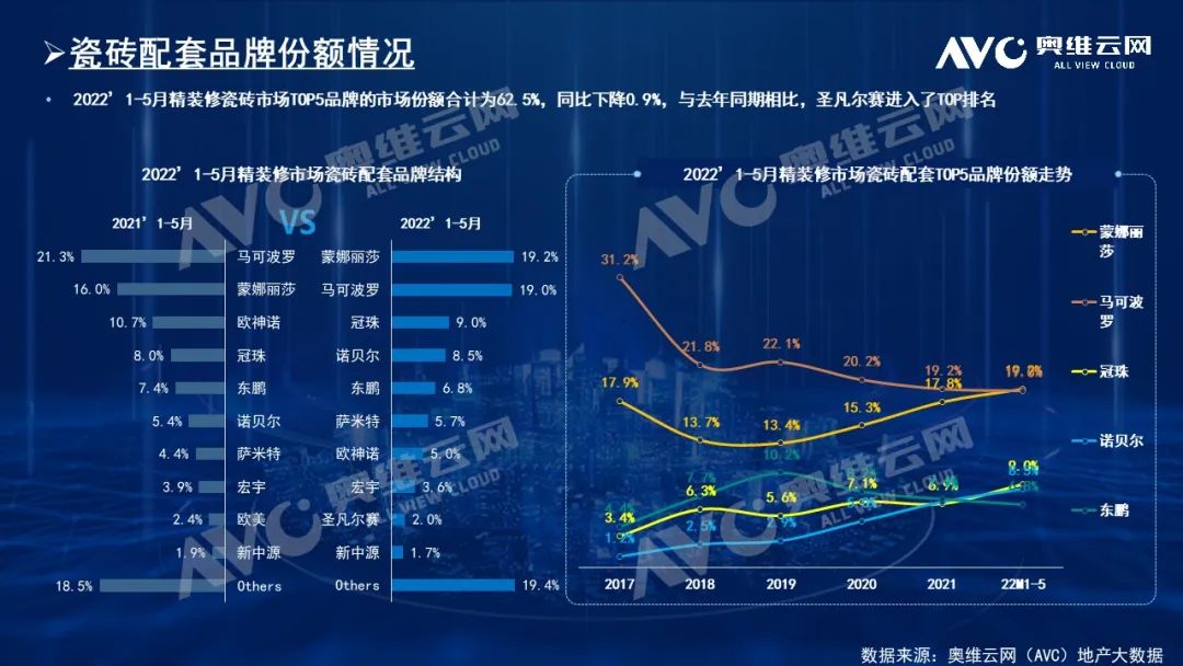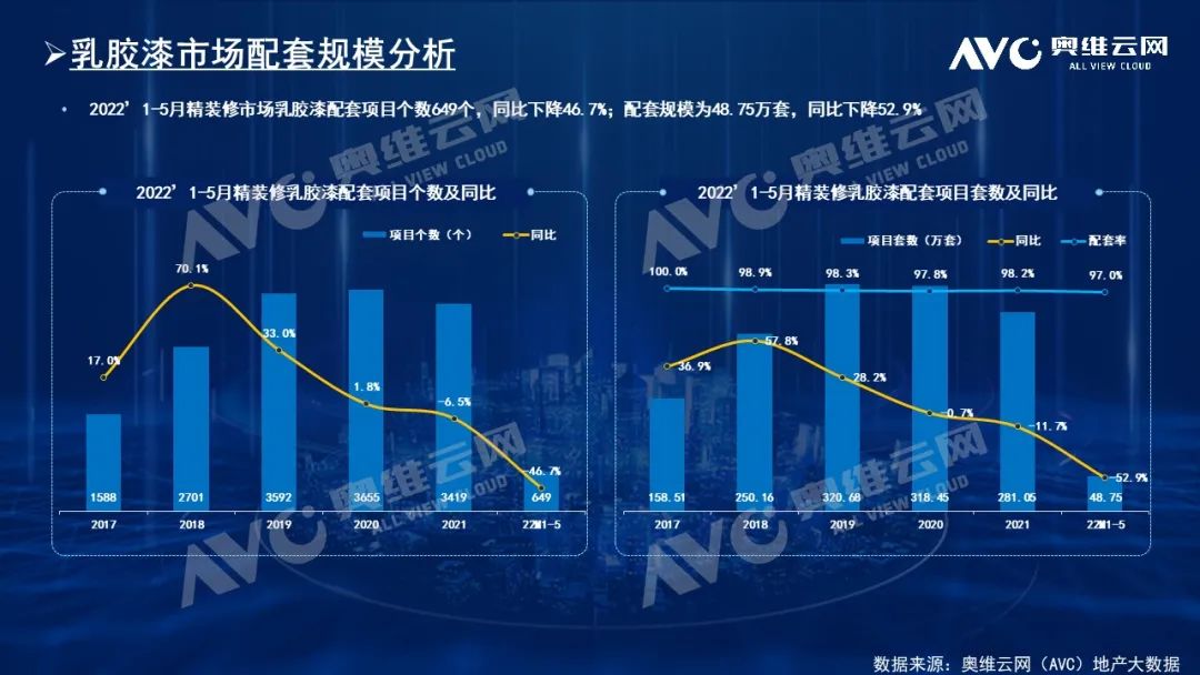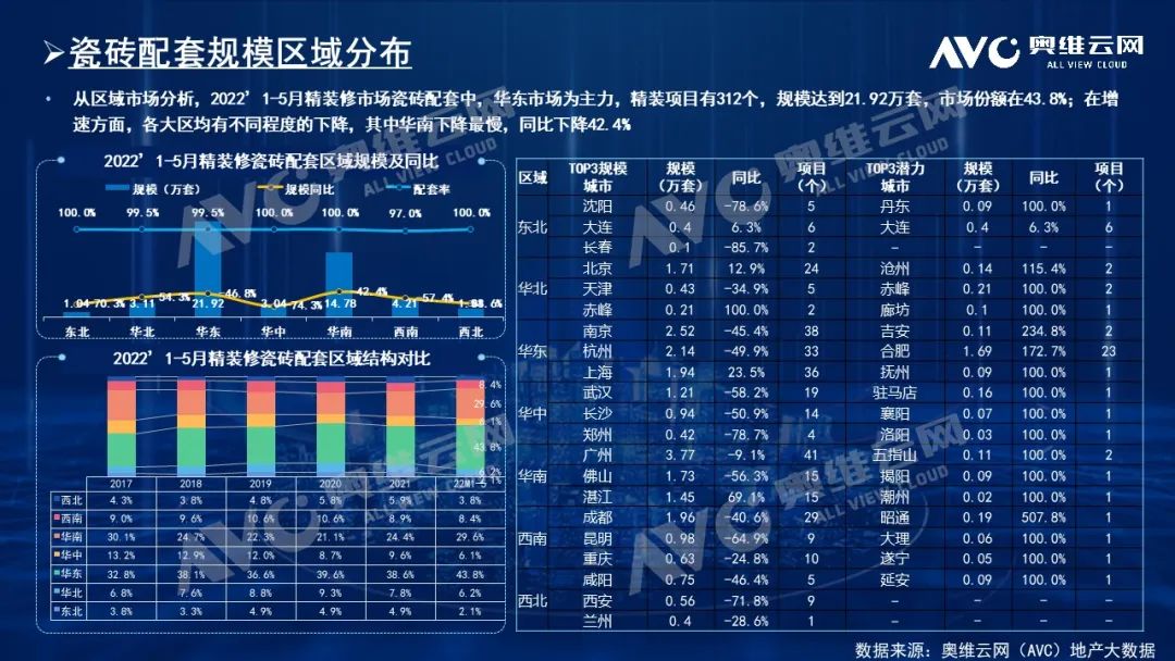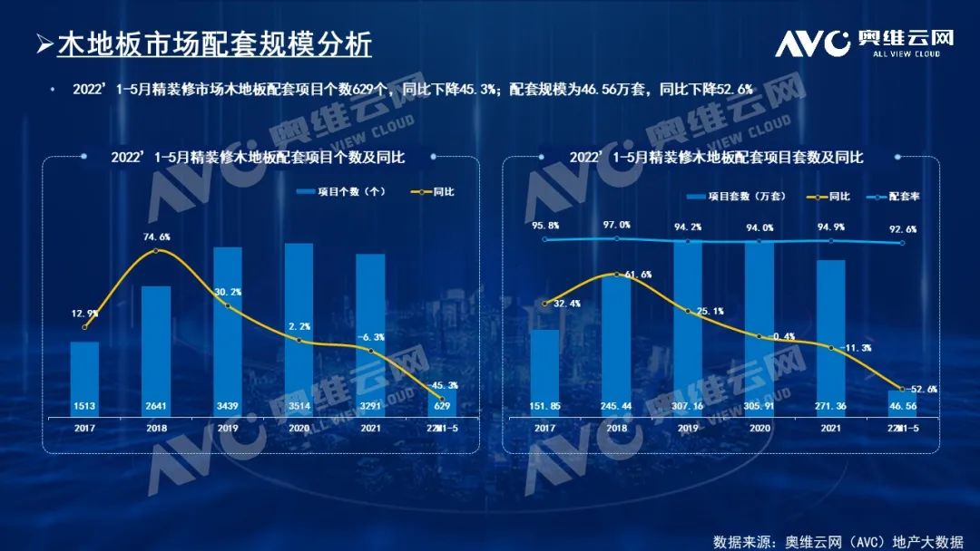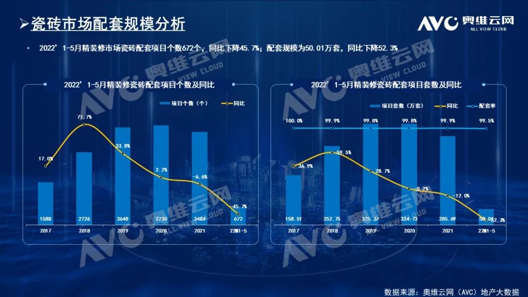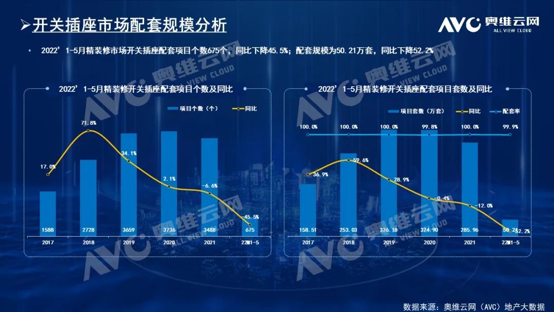 据奥维云网(AVC)监测数据显示,2022年1-5月精装修开盘项目676个,同比下降45.4%,规模50.26万套,同比下降52.1%,整体呈下滑态势。在精装修市场,建材部品(瓷砖、乳胶漆、木地板、开关插座)一直为标配部品,其规模走势基本与精装整体市场保持一致。