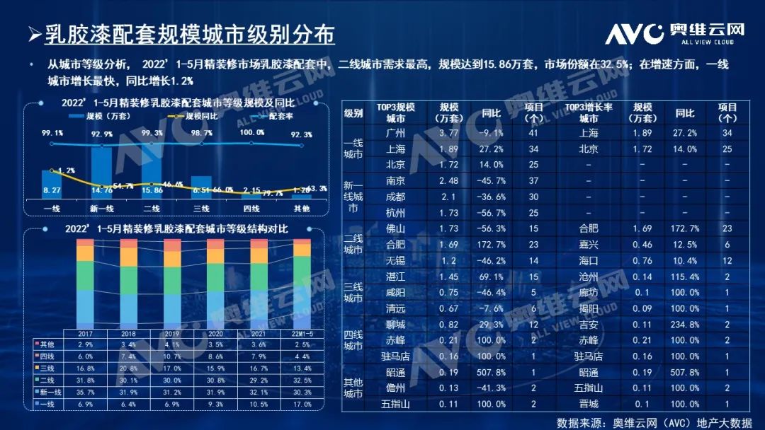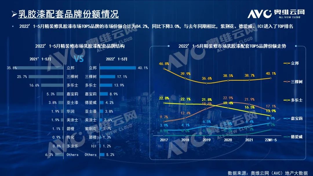 据奥维云网(AVC)监测数据显示,2022年1-5月精装修市场乳胶漆配套规模为48.75万套,同比下降52.9%,配置率达到97.0%。品牌竞争方面,立邦、三棵树、多乐士、嘉宝莉仍稳居TOP4,德爱威以4.2%的份额增长进入TOP5排名。整体品牌集中度有所下滑。与去年同期相比,紫荆花、ICI份额有所提升,进入TOP10排名,后继品牌力争上游。从城市等级分析,二线城市需求最高,规模达到15.86万套,市场份额在32.5%;在增速方面,一线城市增长最快,同比增长1.2%。