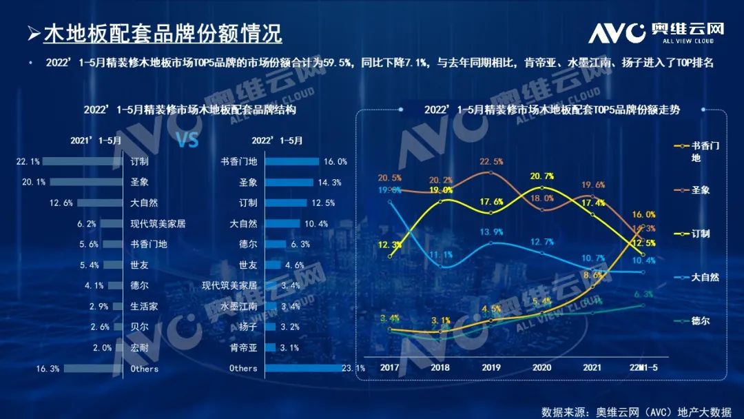 据奥维云网(AVC)监测数据显示,2022年1-5月精装修市场木地板配套规模为46.56万套,同比下降52.6%,配置率达到92.6%。品牌竞争方面,书香门地较去年同期份额增长10.4%居于首位。德尔以2.2%的份额增长跻身TOP5行列。订制份额从去年同期的22.1%下降到12.5%,品牌效应升级。整体品牌集中度有所下滑,其中水墨江南、扬子、肯帝亚份额均有上升。精装修市场木地板配套规模TOP城市中,TOP3城市分别为广州、南京、杭州,规模分别为3.77、2.52、2.18万套。其中广州的TOP1品牌为大自然,南京的TOP1品牌为书香门地,杭州的TOP1品牌为水墨江南。