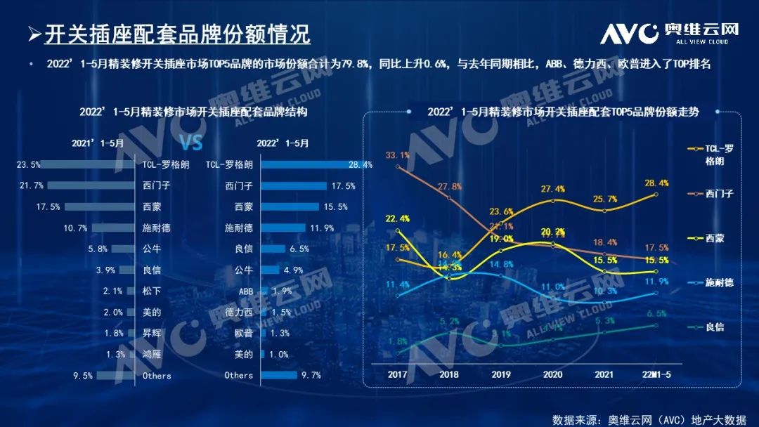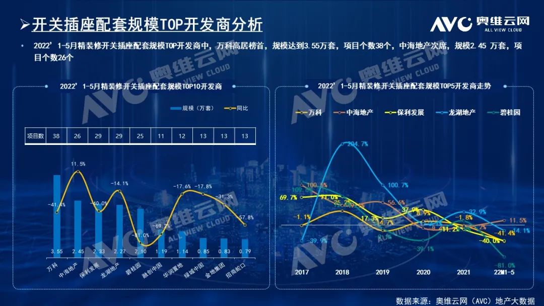 据奥维云网(AVC)监测数据显示,2022年1-5月精装修市场开关插座配套规模为50.21万套,同比下降52.2%,配置率达到99.9%。品牌竞争方面,TCL-罗格朗、西门子、西蒙、施耐德仍稳居TOP4,良信增速明显,以2.6%的份额增长跻身TOP5行列。整体品牌集中度略有上升。在精装修开关插座配套规模TOP开发商中,万科高居榜首,规模达到3.55万套,项目个数38个,主要与良信、西蒙、欧普、西门子、飞雕这些品牌合作。其中,良信排名第一,规模达15234套,西门子的增速最快,同比上升159.9%。
