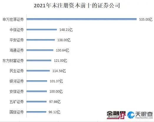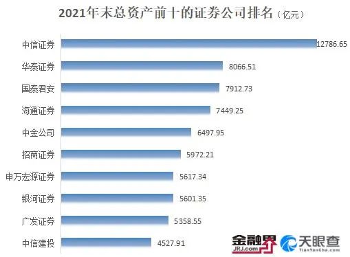 天眼查数据显示,截至2021年末,中金公司、申万宏源总资产分别为6497.95亿元、6010.11亿元。招商证券、中国银河和广发证券均是5000亿级,而中信建投稍逊一筹,其资产总额为4527.91亿元,位列第十名。