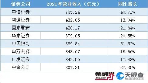 营业收入前四的席位不变,除中信证券外,还有海通证券、国泰君安、华泰证券,三家券商营收分别为432.05亿元、428.17亿元、379.05亿元。中国银河在过去一年发展迅速,其营收排名从第八名直接晋升为第五名。截至2021年末,该公司营业收入较上年同增比长51.52%至359.84亿元。