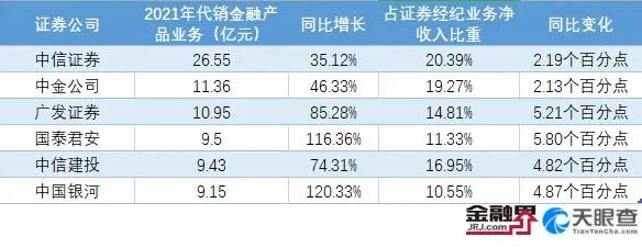 梳理券商年报发现,中信证券代销金融产品净收入率先于2020年突破10亿元大关,截至2021年末,该公司这一业务净收入达26.55亿元,同比增长35.12%。与此同时,代销金融产品净收入占证券经纪业务净收入的比重也由上年的18.20%增至20.39%。值得注意的是,截至2021年末,除中信证券外,中金公司、广发证券代销金融产品规模也已突破10亿元大关,分别为11.36亿元、10.95亿元,二者占经纪业务的比重分别为19.27%、14.81%。