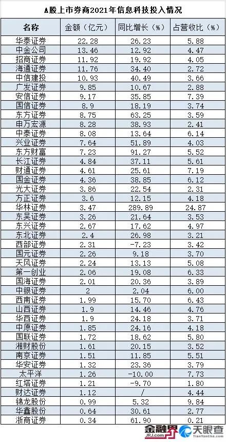 在信息科技投入方面,除中信证券、国泰君安等6家券商未披露外,43家上市券商研发投入超200亿元。天眼查数据显示,截至2021年末,华泰证券研发投入一骑绝尘,较上年同期增长26.23%至22.28亿元。中金公司、招商证券、海通证券、中信建投研发投入均超10亿。