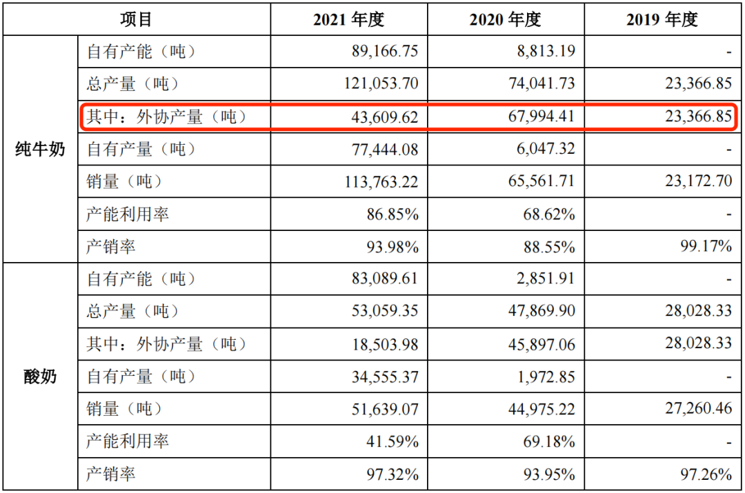 招股书显示,由于自身产能限制,公司会选择行业内资深的合作方,采取“外购奶源”和“产品代工”的形式补充产能。2020年,认养一头牛的纯牛奶和酸奶的外协产量,远超于自有产量,2019年甚至完全依靠外协产量。