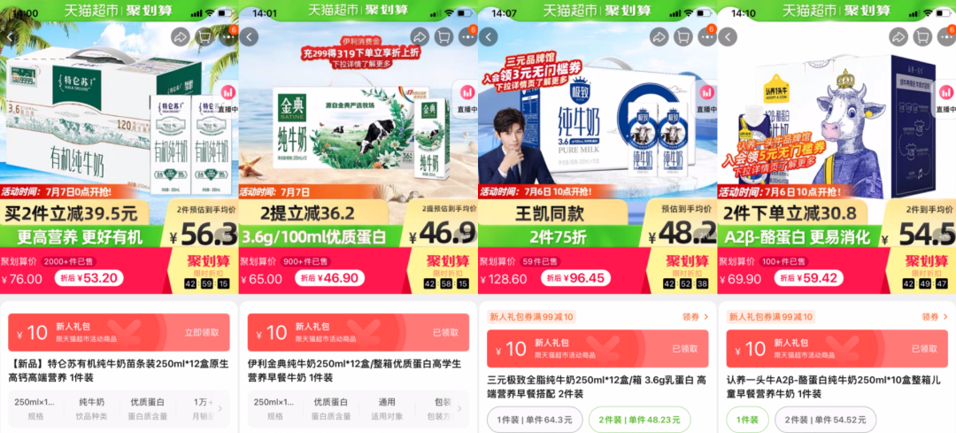 对比价格,开菠萝财经选取天猫超市同一时段的商品进行比较发现,250ml*12盒规则下,特仑苏有机纯牛奶、伊利金典纯牛奶、三元极致纯牛奶的活动价分别为53.20元、46.9元、48.2元,认养一头牛A2β-酪蛋白纯牛奶250ml*10盒的活动价为54.5元。
