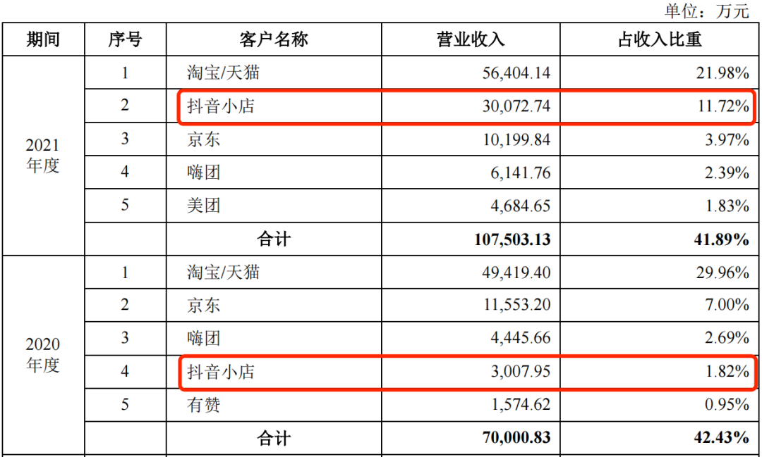 为了做好线上渠道,认养一头牛与天猫、京东等多家电商平台建立合作,同时把握住了抖音、快手等直播电商平台的流量红利。到2021年,抖音小店已成为该公司线上直销的第二大客户,收入占比达11.72%,仅次于淘宝/天猫。