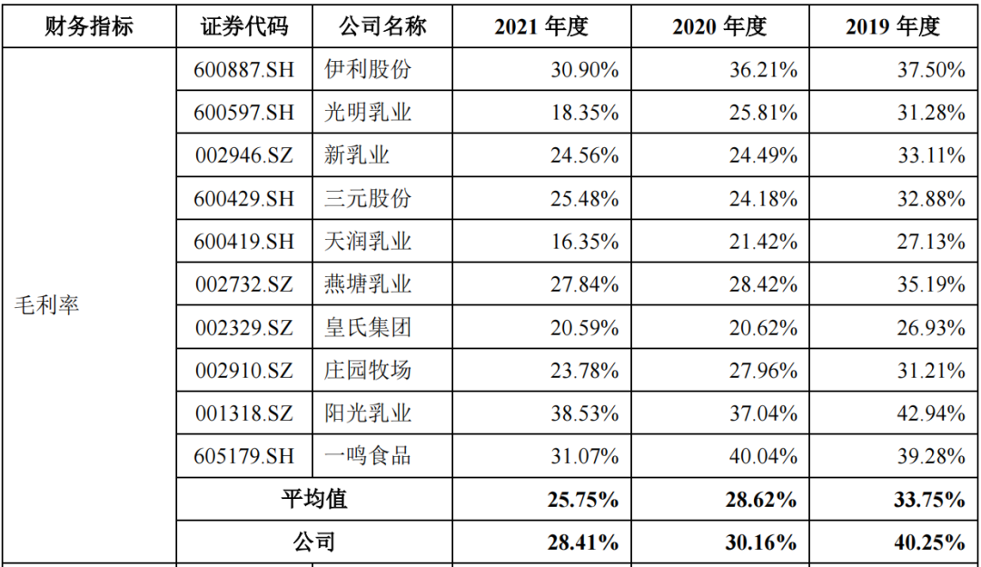 支付着高额营销和渠道费用的认养一头牛,依旧在赚钱。近三年,公司整体毛利率分别为40.25%、30.16%和 28.41%,高于行业平均水平,不过,低于伊利股份和阳光乳业,且呈逐年降低的趋势。