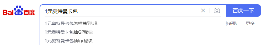 在百度搜索输入“1元奥特曼卡包”,智能搜索链接到的第一条就是“1元奥特曼卡包抽卡技巧”。