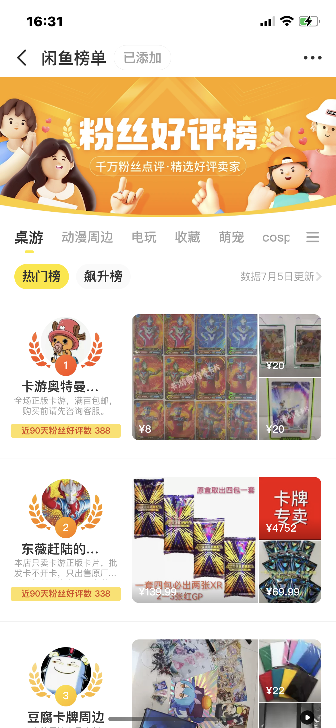 用户“卡游奥特曼卡片”跻身闲鱼“桌游粉丝好评榜”热门榜类目Top1
