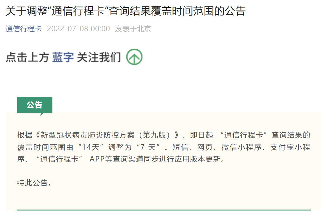 “通信行程卡”微信公众号7月8日凌晨消息,根据《新型冠状病毒肺炎防控方案(第九版)》,即日起 “通信行程卡”查询结果的覆盖时间范围由“14天”调整为“7 天”。短信、网页、微信小程序、支付宝小程序、“通信行程卡” APP等查询渠道同步进行应用版本更新。