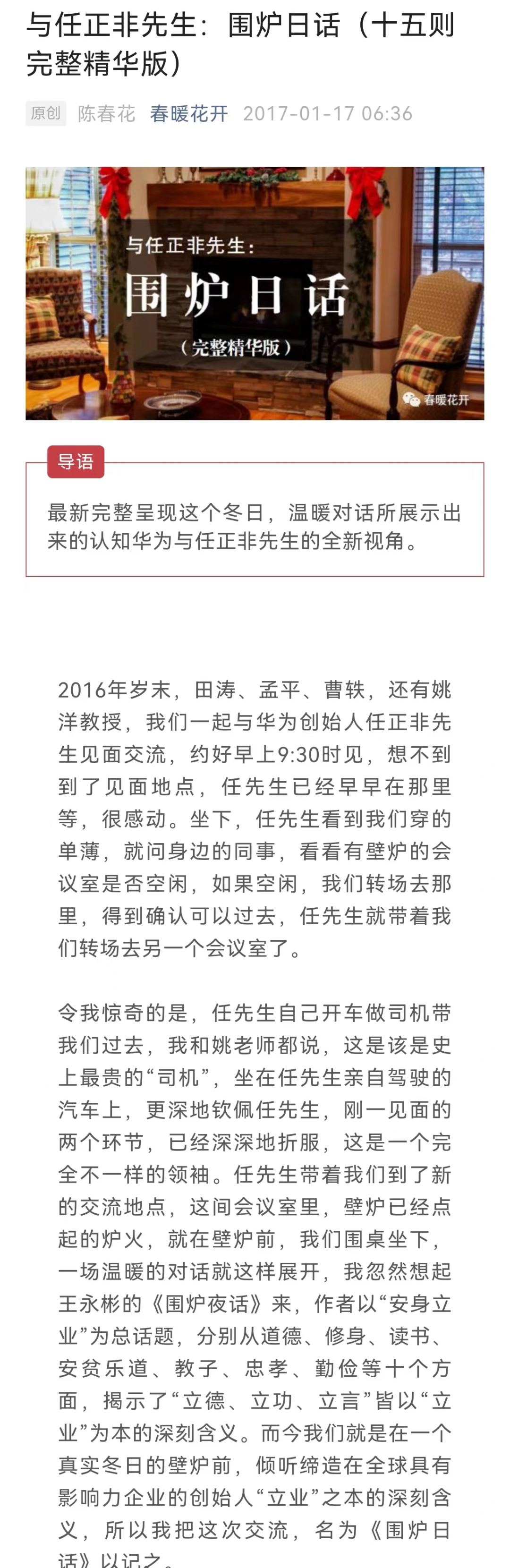 《豹变》发现,上述与华为相关的内容改编自2017年1月17日陈春花在其微信公众号“春暖花开”上发表的文章《与任正非先生:围炉日话》。原文为: