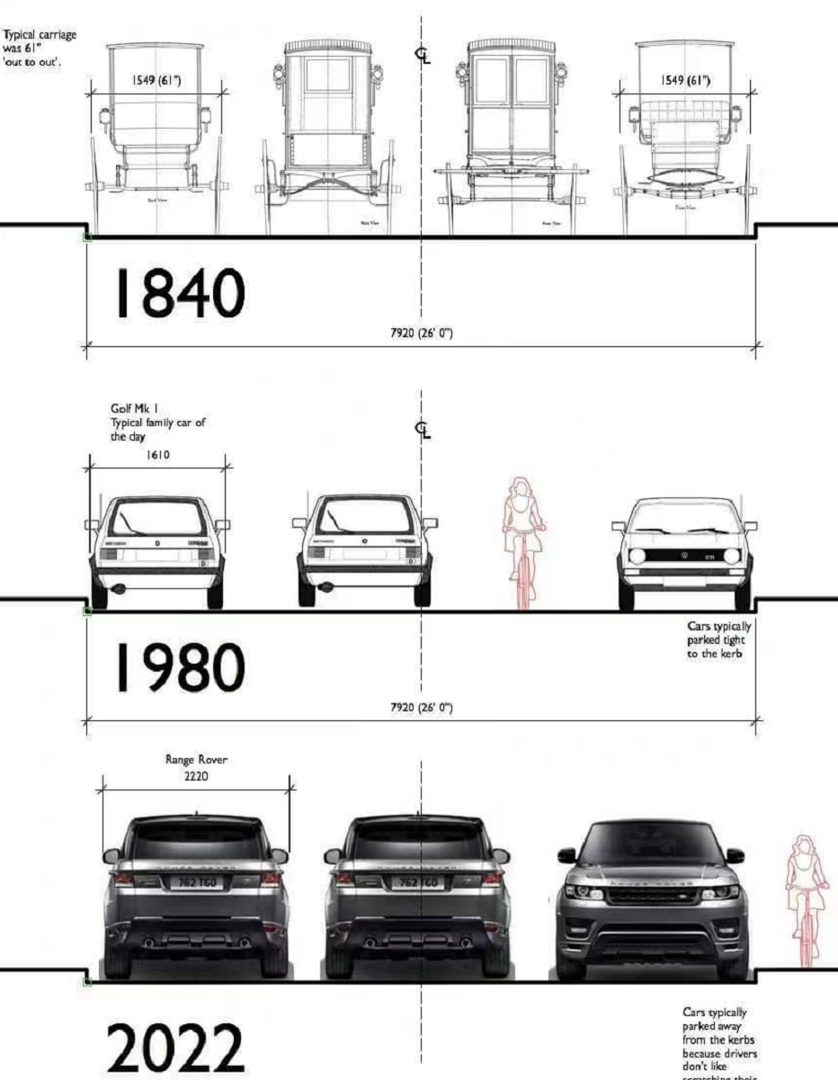 海外博主AlexHowat发了一组图,展示了城市道路上车辆越来越宽的趋势。