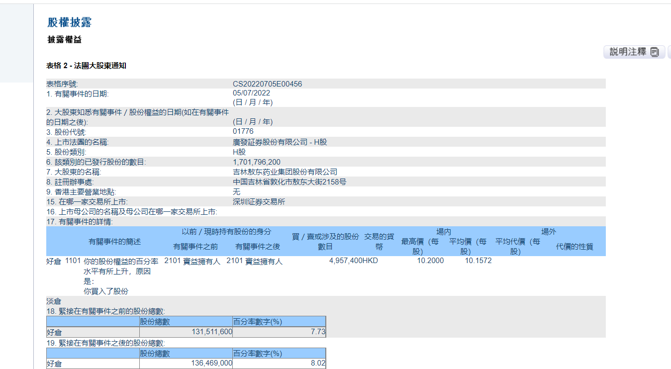 近日,港交所披露易显示,广发证券主要股东之一吉林敖东又开始增持。
