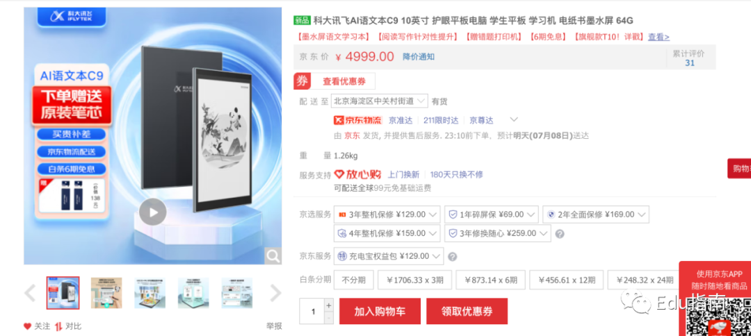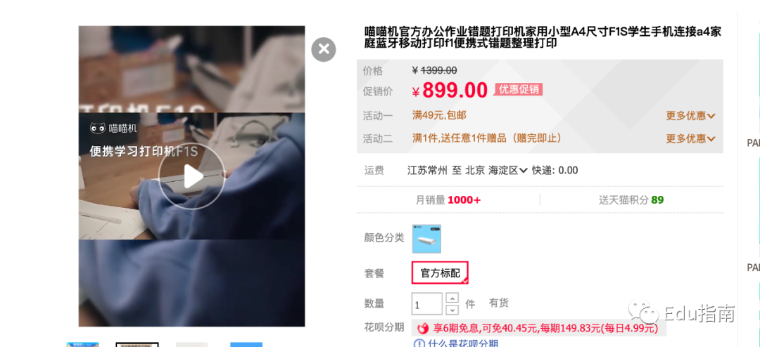 此外,作业帮今年4月发布“喵喵机学习打印机F1”,支持试卷还原、错题整理等功能,根据喵喵机旗舰店数据,该产品定价为899元,月销量1000+。