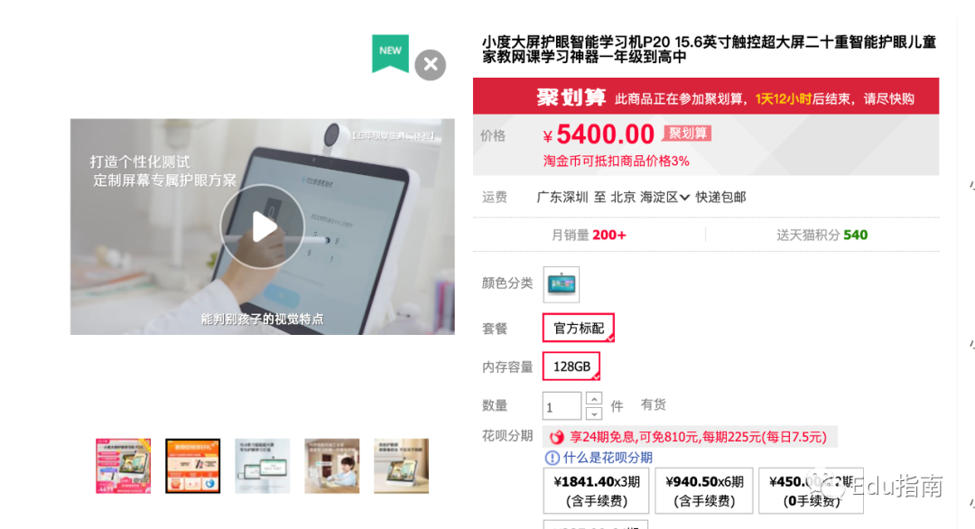 今年6月,百度旗下小度科技公司上线新款智能学习机P20,当前定价为5400元,月销量为200+。根据介绍,该学习机主打“超大屏智能护眼、儿童家教网课家教神器”,学习机内置多版本教材,支持小学一年级至高中学龄阶段学生学习。