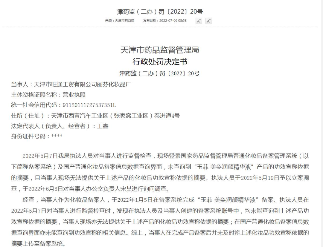 无独有偶,同日,天津药监局发布的另一则行政处罚信息则显示,今年5月7日,执法人员对天津市旺通工贸有限公司丽芬化妆品厂(下称天津丽芬)进行检查时发现,该公司在今年1月5日完成备案的“玉菲 美奂润颜精华液”也未上传产品功效宣称依据的摘要。并且,天津丽芬现场也无法提供关于该产品的化妆品功效宣称依据的摘要。