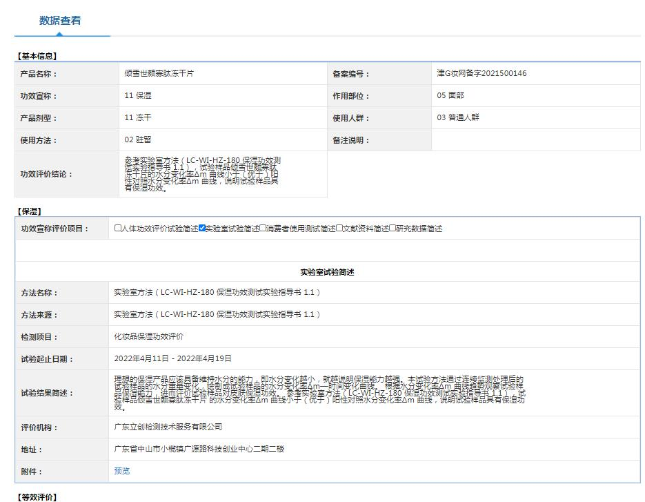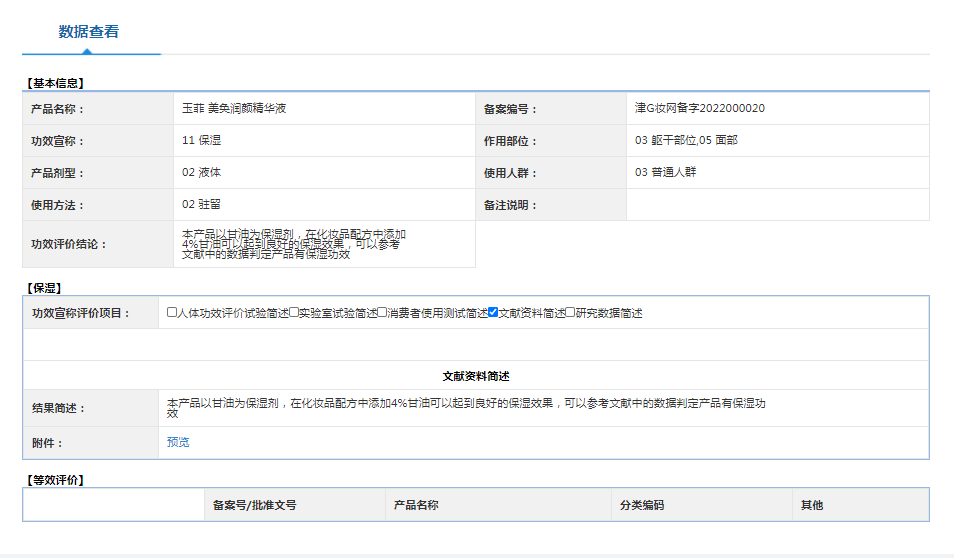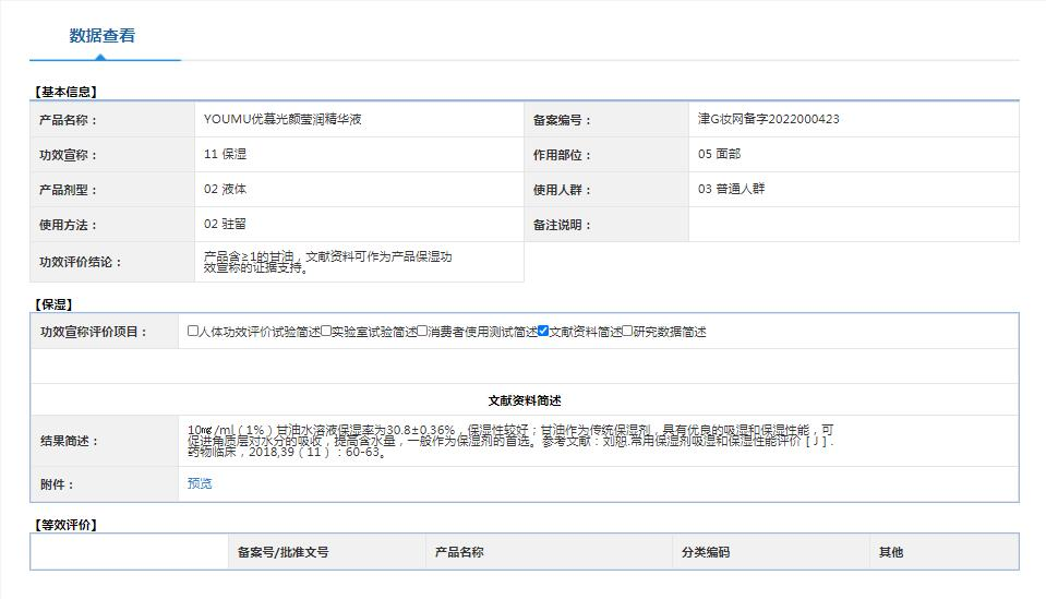 今日,青眼在国家药监局普通化妆品备案信息平台上查询了解到,上述3款涉案产品的功效评价均已上传,它们功效宣称均为“保湿”。其中“YOUMU优慕光颜莹润精华液”和“玉菲 美奂润颜精华液”的功效评价方式为甘油的文献资料简述;“倾雪世颜寡肽冻干片”使用的是实验室试验功效评价方法。