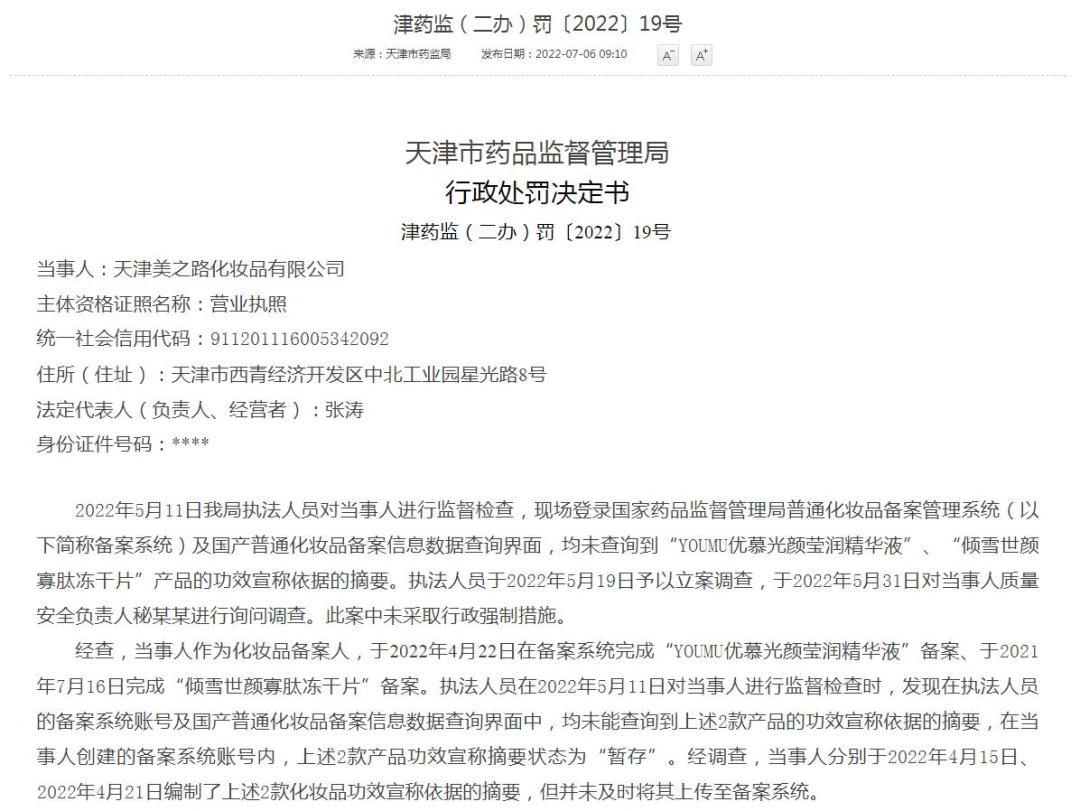 根据行政处罚决定书,天津美之路化妆品有限公司(下称天津美之路)分别在2021年7月16日和2022年4月22日完成了“YOUMU优慕光颜莹润精华液”和“倾雪世颜寡肽冻干片”2款产品的备案。然而,执法人员在今年5月11日登录国家药监局普通化妆品备案管理系统及国产普通化妆品备案信息数据查询界面时,均未查询到上述2款产品的功效宣称依据的摘要。