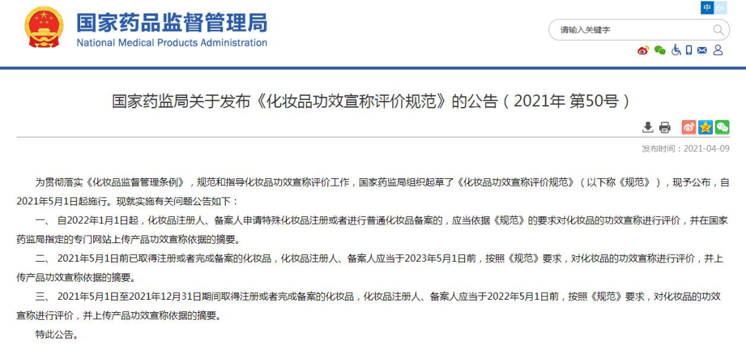 根据《国家药监局关于发布的公告(2021年第50号)》要求,2022年1月1日起,化妆品注册人/备案人申请特殊化妆品注册或者进行普通化妆品备案的,应当依据《化妆品功效宣称评价规范》(下称《规范》)的要求对化妆品的功效宣称进行评价,并在国家药监局指定的专门网站上传产品功效宣称依据的摘要;2021年5月1日至2021年12月31日期间取得注册或者完成备案的化妆品,则应当在今年年5月1日前,对化妆品的功效宣称进行评价,并上传产品功效宣称依据的摘要。