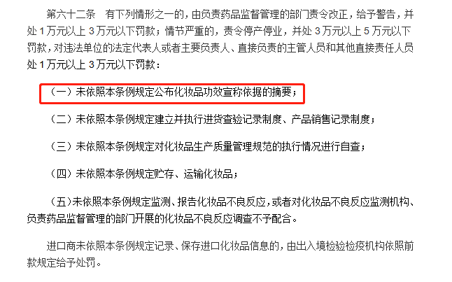 上述两份行政处罚书中均明确表示,涉案产品违反了《化妆品监督管理条例》第二十二条“化妆品的功效宣称应当有充分的科学依据。化妆品注册人、备案人应当在国务院药品监督管理部门规定的专门网站公布功效宣称所依据的文献资料、研究数据或者产品功效评价资料的摘要,接受社会监督”的规定。
