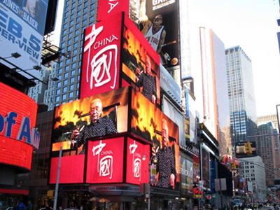 美国纽约时报广场有“世界的十字路口”之称,这里的年均游客流量4000万人次、人员流量1亿人次,被视为“吸引全球目光”的最佳窗口之一。2011年1月17日,中国国务院新闻办筹拍的《中国国家形象片——人物篇》在美国纽约时报广场大型电子显示屏上播出,中国红色格外显眼,中国各行各业的杰出代表如谭盾、郎朗、袁隆平、杨利伟、姚明、邓亚萍、杨丽萍等在片中依次登场,不断吸引路人驻足观看。