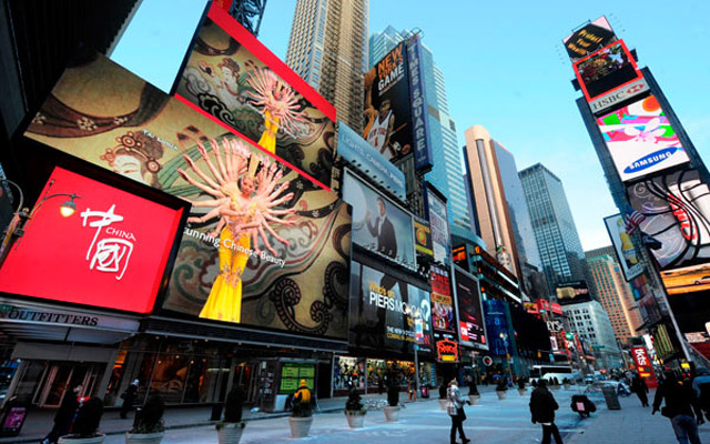 有媒体报道称,新华社全资子公司新华影廊、大连户外媒体集团国域无疆、蓝色光标旗下子公司蓝色天幕分别于2011年、2012年、2014年租下了纽约时报广场上的屏幕,做起代理时报广场广告牌的生意,专门招徕那些希望在时报广场上亮相的中国企业。虽然在上百块广告屏幕中,这些中国广告大多一点也不起眼,但发到国内的新闻稿上,它足以显得国际范儿、高大上。