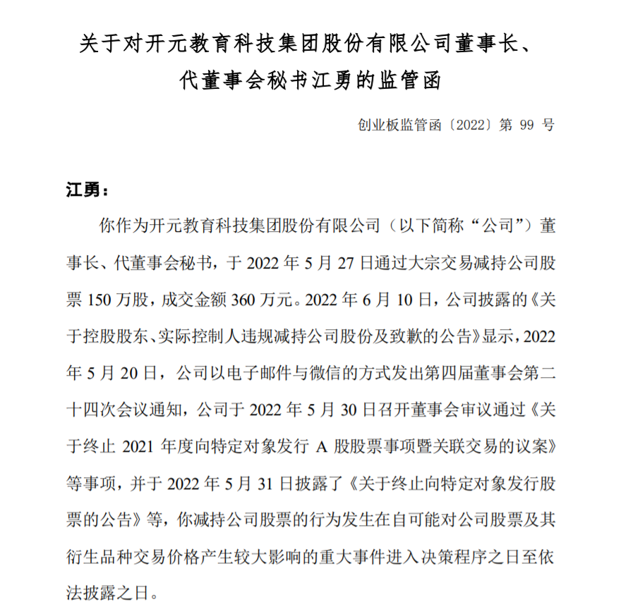 6月13日,江勇收到了深交所下发的监管函。开元教育随后公告解释称,“对法律法规、规范性文件理解有误”。
