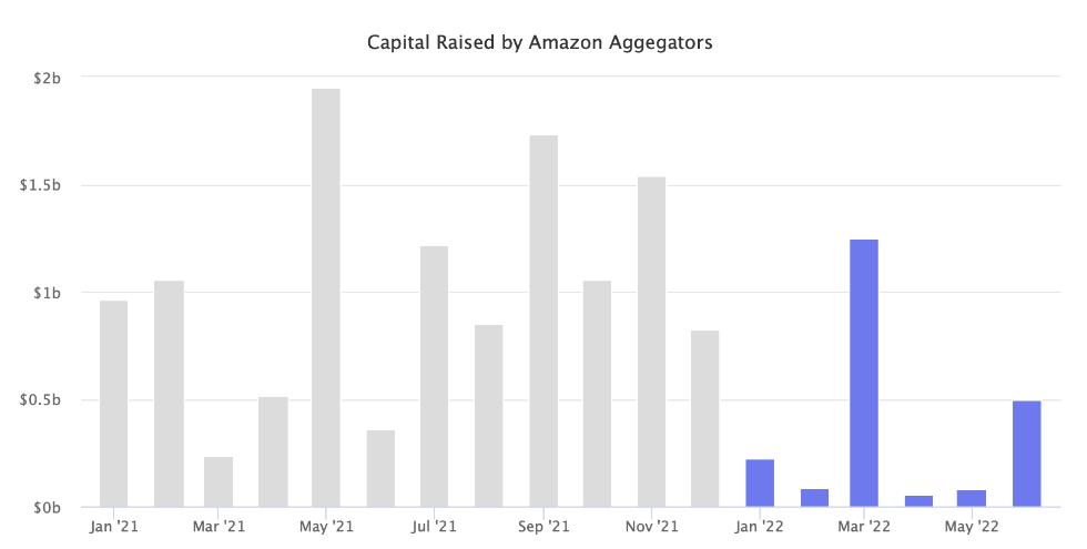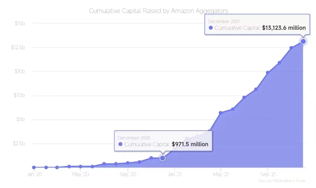 报告显示,2021年,亚马逊第三方品牌聚合商融资总额高达120亿美元,共有39家新公司完成融资。仅2021年上半年,就完成55亿美元融资,其中有22家是新入局的。而对比2022年上半年,他们只融到22亿美元,仅有12家新成员,融资总额还没有2021年同期的一半。