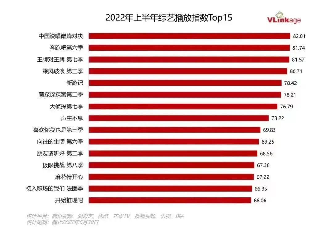 从市场数据表现来看,据骨朵2022综艺热度指数排行榜top10,爱奇艺占据4席,腾讯视频、芒果TV各占3席。在VLinkage发布的2022年上半年综艺播放指数TOP15、上半年网络综艺播放指数TOP10榜单显示,仅开播上线两期的爱奇艺自制综艺《中国说唱巅峰对决》以82.01的成绩登顶双榜TOP1,超过《奔跑吧》《王牌对王牌》等老牌综艺劲旅;而芒果TV《乘风破浪第三季》以及腾讯视频《新游记》则分列网络综艺播放指数榜单二、三位。