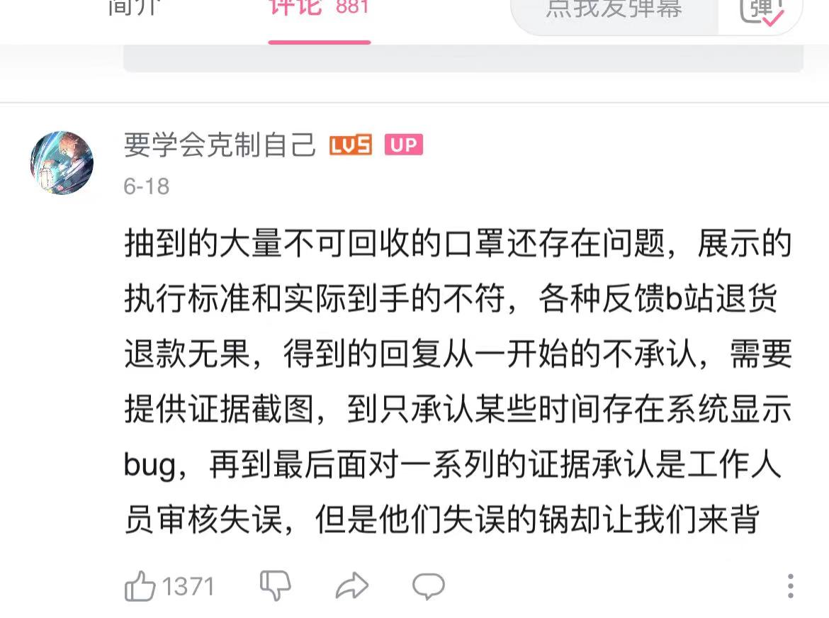 该up主在评论区称,抽到的大量不可回收的口罩还存在问题,展示的执行标准和实际到手的不符,各种反馈B站退货退款无果,得到回复也多次变更,从拒不承认到系统bug,再到人工审核失误,借口频出不解决问题。