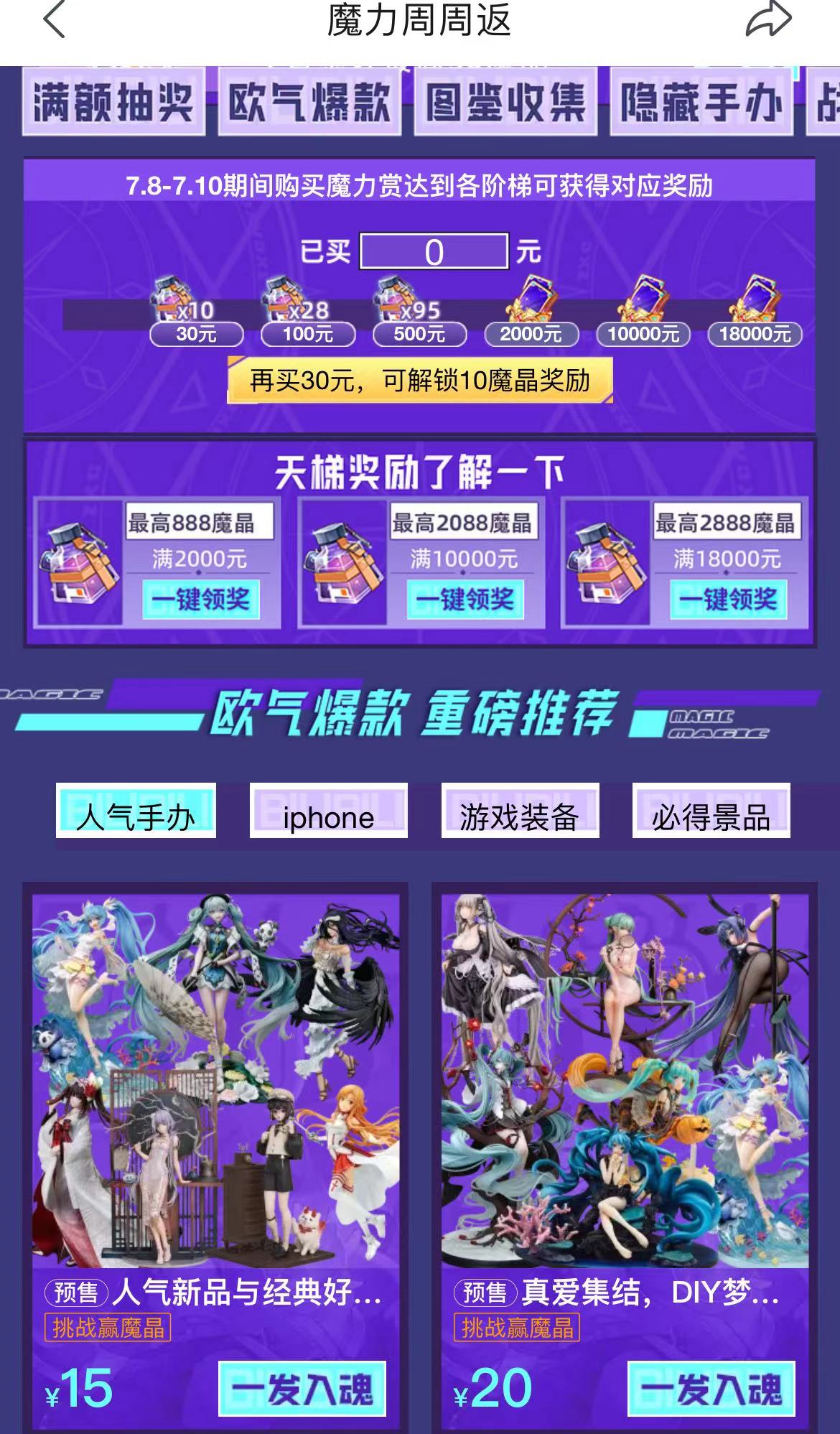 进入魔力赏页面,欧气爆款动漫IP手办、3C数码等抽奖产品赫然在目。和玲琅满目手办形成鲜明对比的是低至15元,高至99元的“一发入魂”,以及售价更贵,从75元至400元以上的“五发不重”。