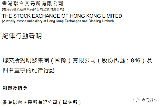6月29日,香港联交所发出一份极为“严厉”的声明。这份声明标题为《联交所对明发集团(国际)有限公司及四名董事的纪律行动》。
