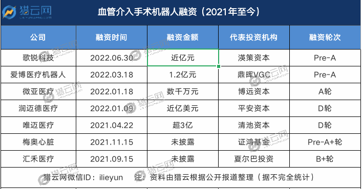 虽然处于发展早期,但作为手术机器人市场的新增量,基于明朗的行业前景,血管介入赛道远不止润迈德一个玩家,也不断有新入局者涌现,备受资本关注,从2021年至今陆续有相关企业获得资本加注。