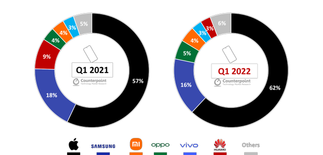 Counterpoint公布的数据显示,2022年Q1,全球高端智能手机(约人民币2680元以上)中,OPPO和vivo分别均占据5%和3%的市场份额,相较一年前,几乎没有变化。作为对比,苹果的市场份额为62%,同比增长5%。