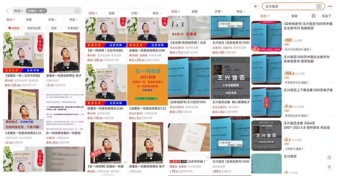 一条盗印盗版链就此清晰了起来:相关利益者在网上通过热点话题批量制造爆款文章,产出骇人听闻的论点,煽动大众情绪。而依此带来的高话题度,让线下盗版商可以持续不断地售出低成本的各类非法出版物,乃至为其线上的盗版书店引流。张一鸣、王兴等谣言文章泛滥之时,各类电商平台上,大量的10w+销量盗印书就是很好的佐证。