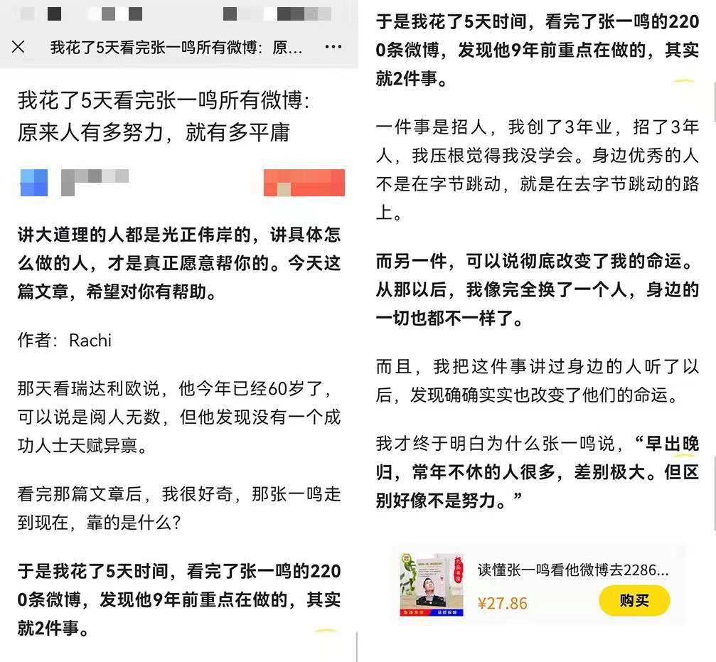 这些文章内容大同小异,作者们声称,通过搜集整理知名企业家的社交平台言论,就可以归纳出成功人士的经营之道,甚至“分享给我身边的朋友后,确确实实也改变了他们的命运。”