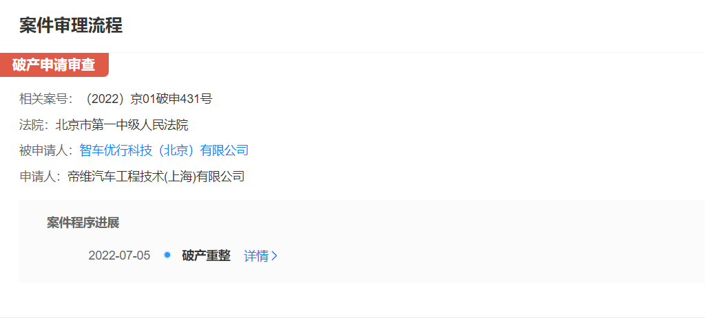 几天后,通过天眼查资料显示,连线出行发现智车优行北京公司新增一条强制破产重整的消息。具体来看,强制破产申请的申请人是帝维汽车工程技术(上海)有限公司。据赵斌介绍,这家公司正是与奇点汽车合作的供应商之一,大概率也是因为款项拖欠向奇点申请了强制破产重整。