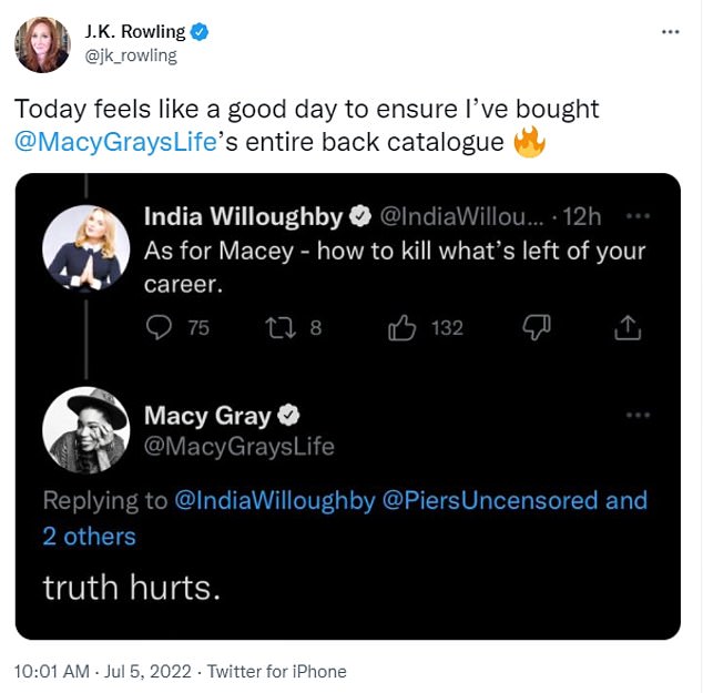 葛蕾的言论激起了轩然大波,跨性别主播英迪娅·威洛比(India Willoughby)认为葛蕾的发言无疑是在“自毁职业生涯”,而葛蕾则回复道,“事实就是这么残酷。”罗琳也加入了这场对话,她截图两人的评论并写道,“感觉今天是个确保我买了梅茜·葛蕾所有专辑的好日子。”