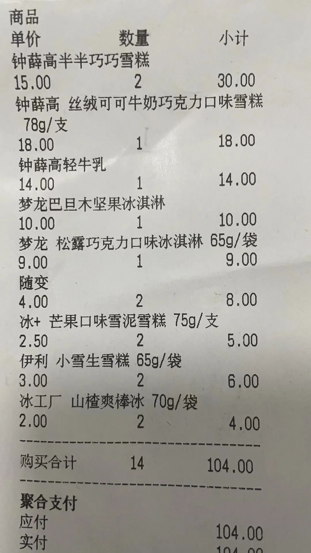 首先,这次钟薛高是实实在在出了圈。在撰写《钟薛高是怎么得罪了年轻人的?》一文时,为了更更加客观的了解到钟薛高这次为何会引起如此大的争议,驼鹿新消费曾在京东便利店调研,并购买了包括钟薛高、梦龙、随变等多个品牌共计14支雪糕,共计花费104元。在打印小票时,旁边另一名售货员看到售货机上显示的付款金额时,脱口而出“这么贵,你买了钟薛高了吧?”。