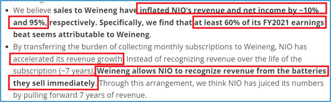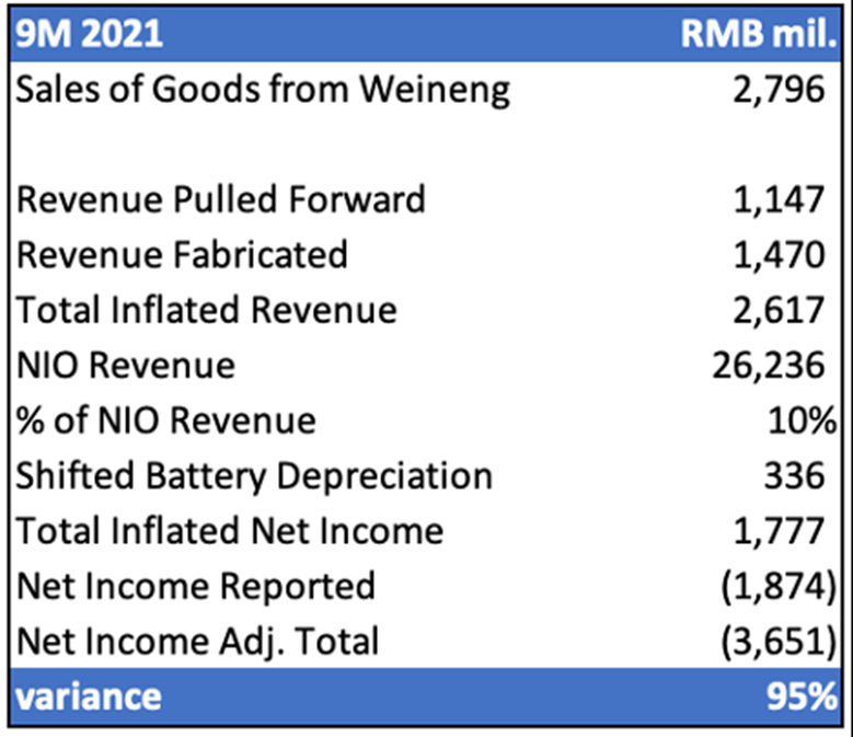 通过向武汉蔚能供应过量的电池并将收入前置,蔚来汽车在截至 2021年9月的9个月内虚增了26亿元人民币的收入(约占当期收入的10%)。更糟糕的是,该期间本应报告36亿元人民币的净亏损,这是蔚来汽车实际报告的亏损数额的两倍。