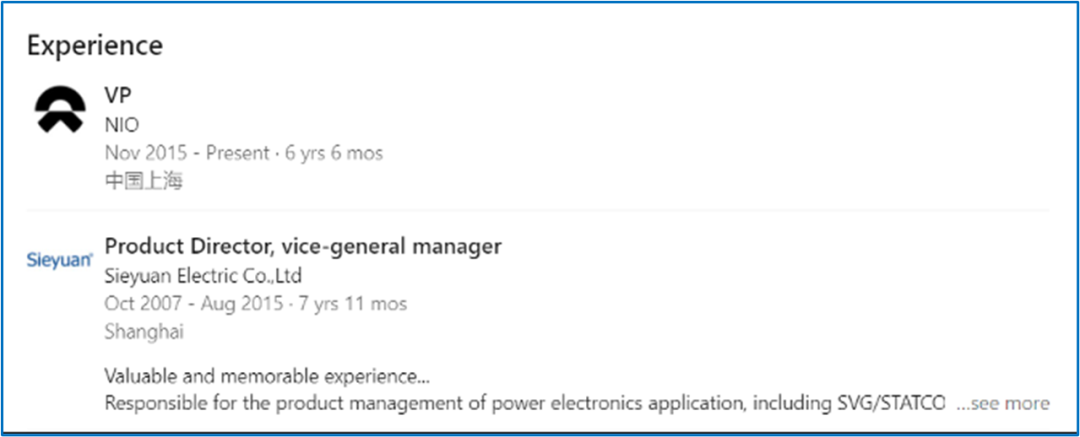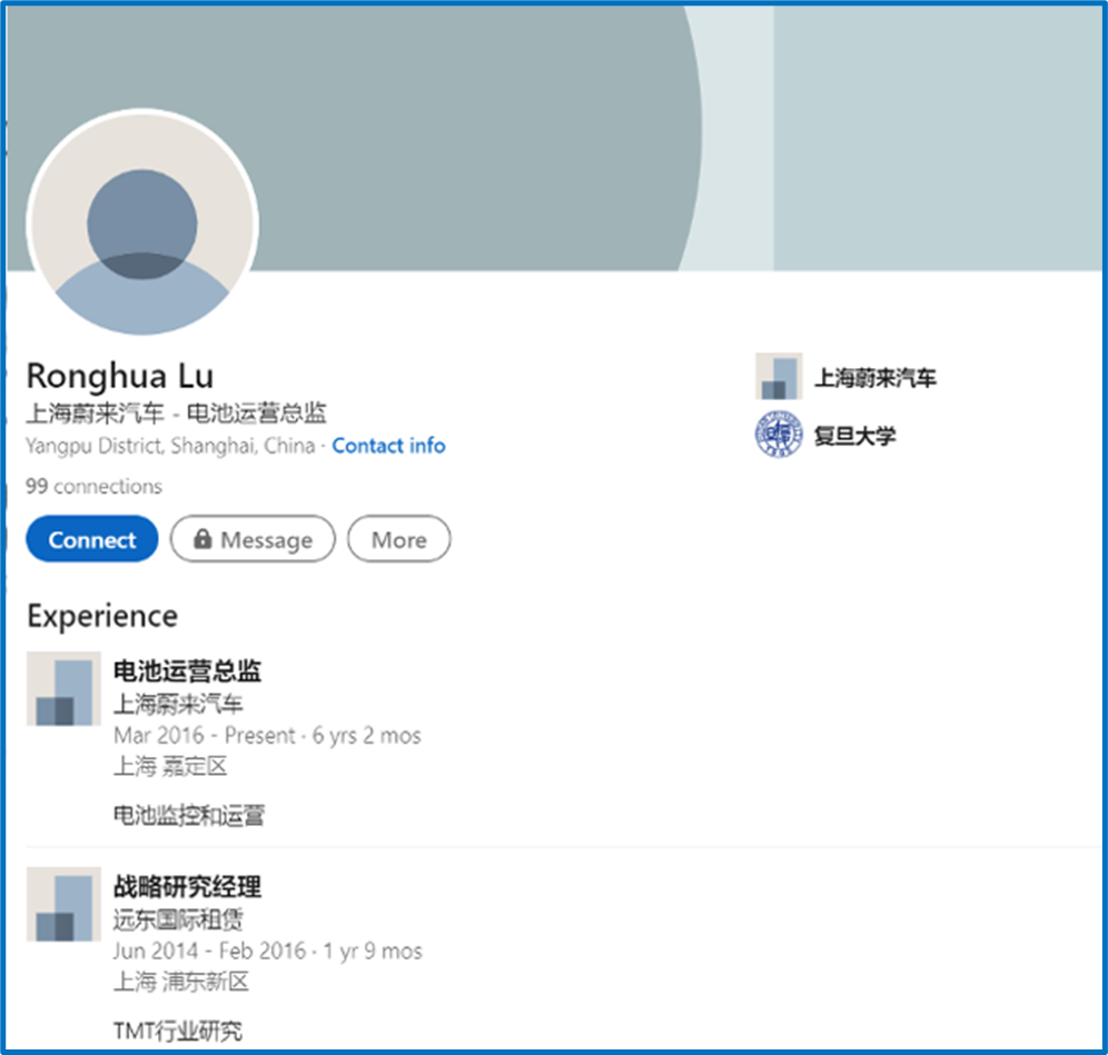 根据陆荣华的LinkedIn资料,他从2016年3月开始就职于蔚来汽车,目前是蔚来汽车主要子公司之一“上海蔚来”的电池运营主管。