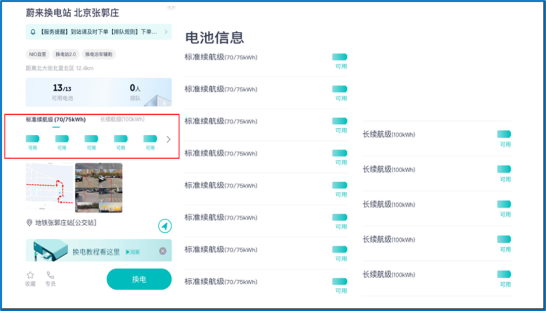 我们通过 NIO 应用程序进一步确认没有区别。例如,下面的屏幕截图显示了北京的一个换电站。选择此交换站后,应用程序不会询问用户他/她是否是 BaaS 订购用户。它直接显示该站有多少电池可用。在这种情况下,它显示总共有13 块电池,且有13块电池可供更换。
