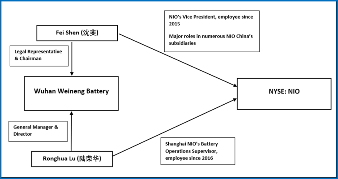 我们认为,这两个人领导了武汉蔚能电池的日常运营和重大商业决策。我们的研究还发现,在蔚能任职期间,沈斐和卢荣华都继续在蔚来担任高管职务。