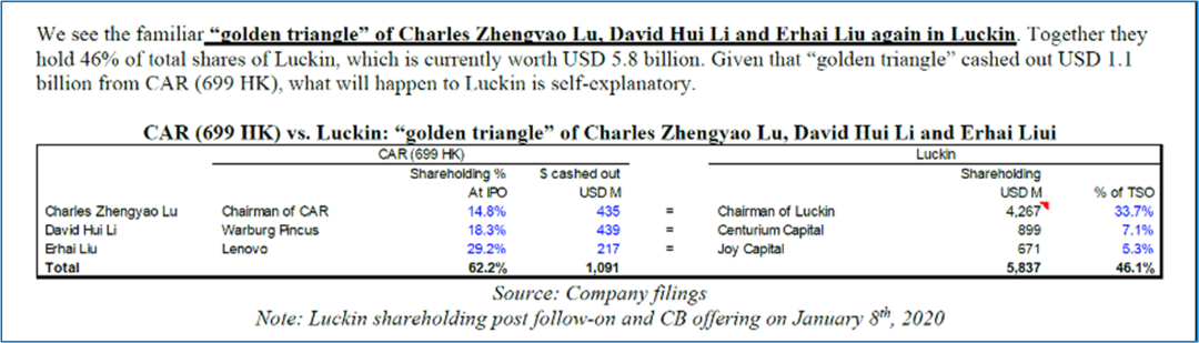 考虑到刘二海此前参与了香港上市公司神州租车(HK.699)和美国上市的瑞幸咖啡(OTC:LKNCY),我们认为当上市公司或管理层与Joy Capital过于密切时时,投资者应格外谨慎。