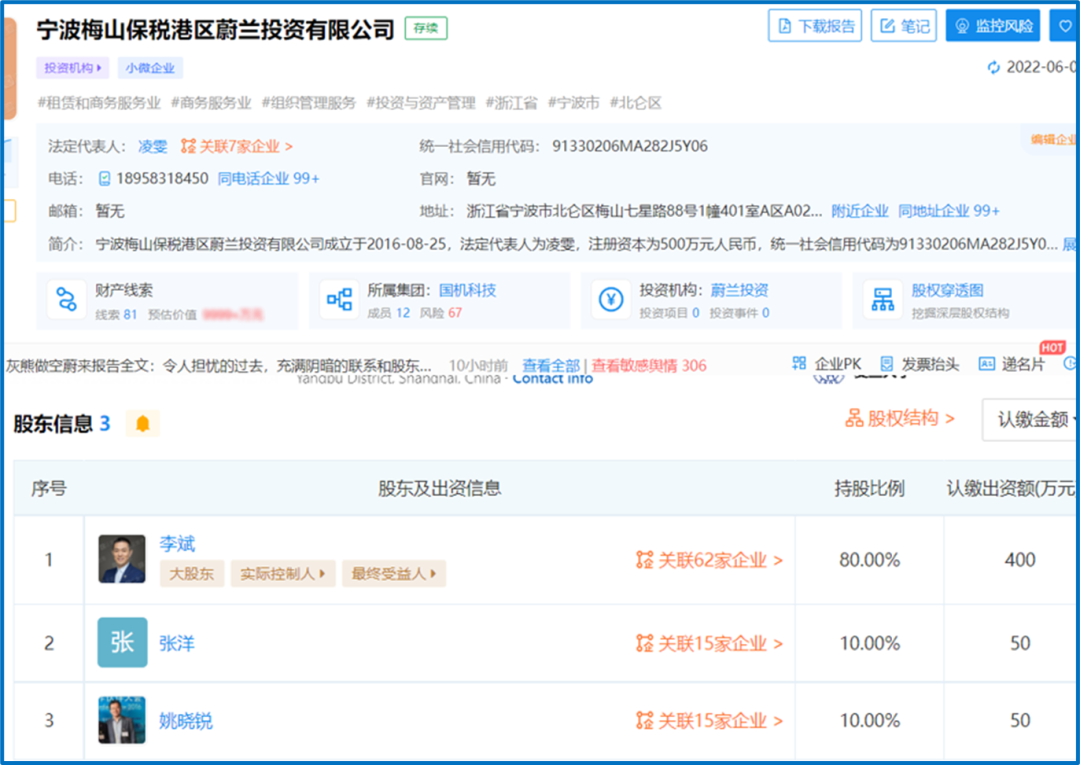 据企查查介绍,宁波梅山成立于2016年8月,主要从事投资咨询和管理业务。股东资料显示,蔚来汽车董事长李斌持有宁波眉山80%的股份,是这些无息贷款的直接受益人。