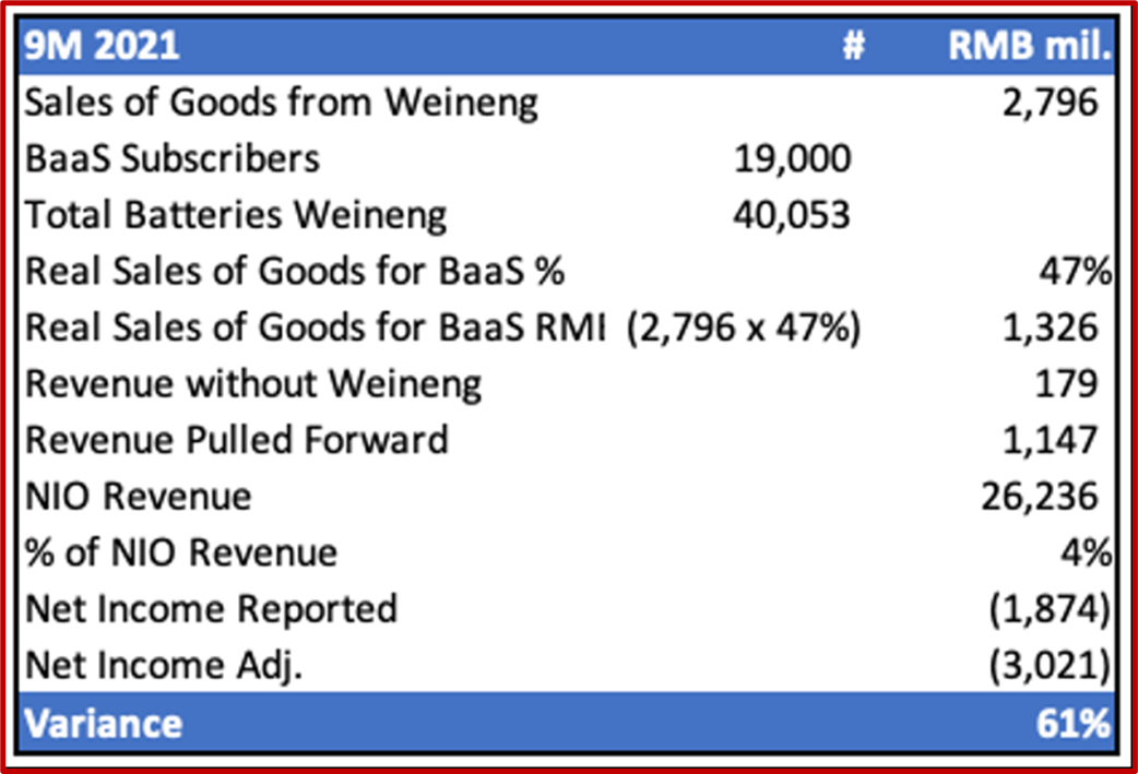 根据这些数字,我们可以确定,如果没有武汉蔚能,蔚来的财务状况会是什么样子:决不是蔚来报告中的27.96亿元人民币;蔚来汽车每月实际电池租赁收入只有1984万元人民币,或截至2021年的9个月的1.79亿元人民币(2021年约为2.39亿元人民币)。
