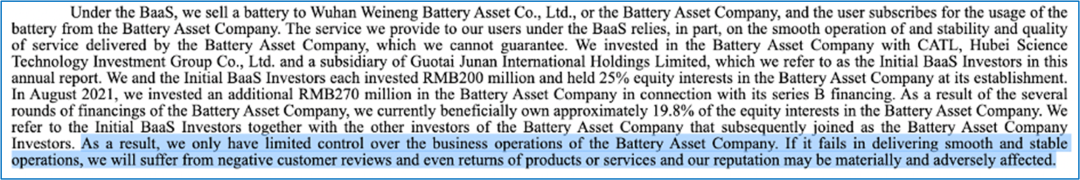在其 2021年20-F风险因素中,蔚来表示他们对武汉蔚能电池的控制有限。