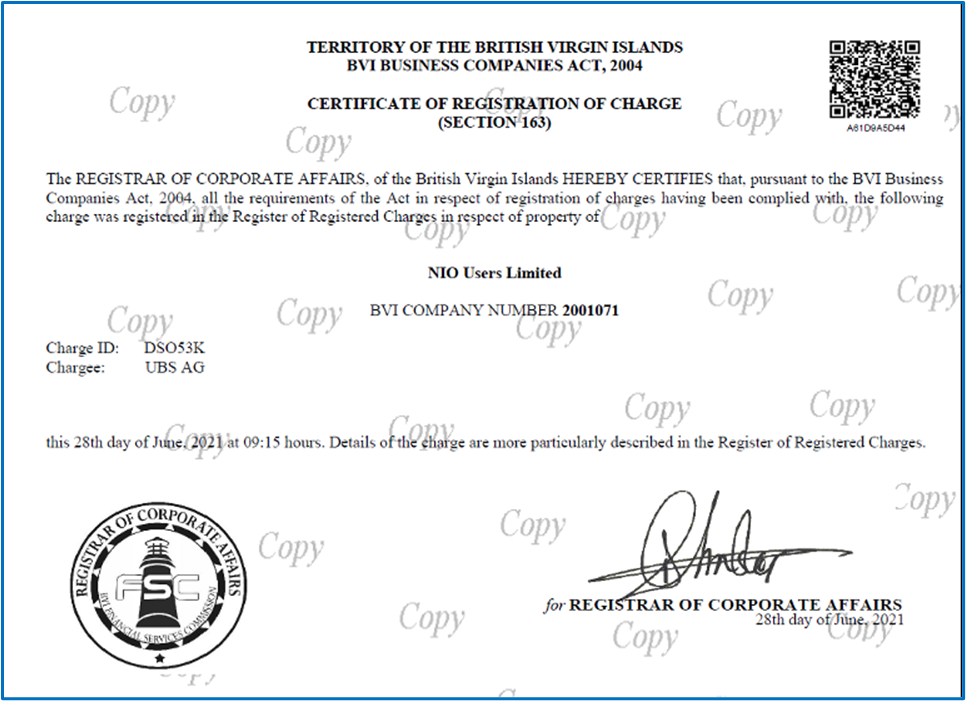 蔚来汽车披露的文件显示,2021年 6月,蔚来汽车用户信托已经被质押给瑞银集团。一份名为“变更证书”的文件显示,蔚来汽车用户有限公司被UBS AG 收取费用,费用登记日期为2021年6月28日。