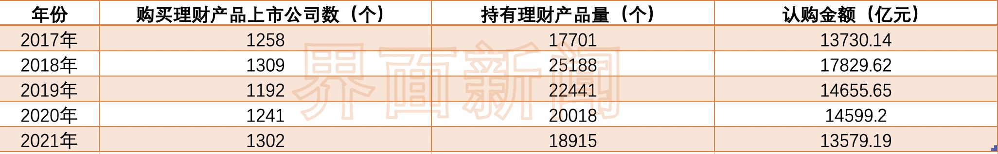 此外,界面新闻记者从银行理财产品、证券公司理财、投资公司理财产品、信托产品等四个赛道,梳理了上市公司在细分领域的投资情况。总体来看,就上述四个赛道,上市公司更倾向于将资金放入银行,但这种趋势正在逐年下滑,2017年至2021年银行理财产品认购额年平均增长率为-18.54%。